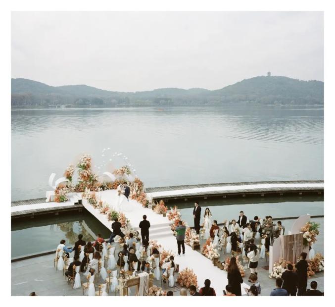 2023年12月9日,一对新人在太湖边隆重举办婚礼仪式,亲友们前来祝贺。