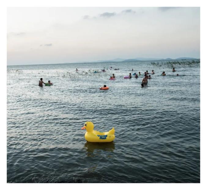 2016年7月31日,太湖里的小黄鸭和一群游泳的人们。