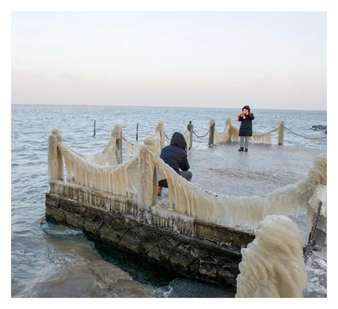 2016年1月24日,冰棱挂满围栏的湖边,游客在拍摄风景。