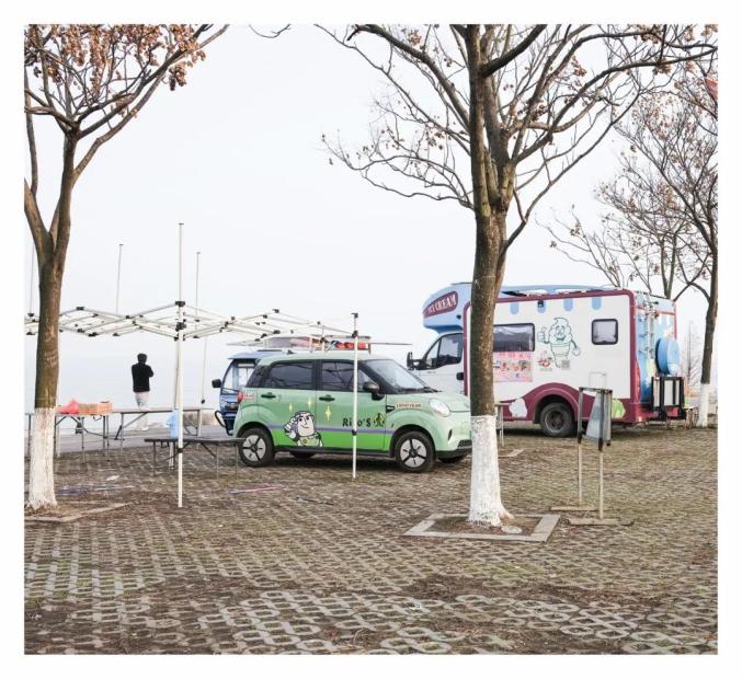 2024年1月1日,外地游客开着房车来太湖边游玩。