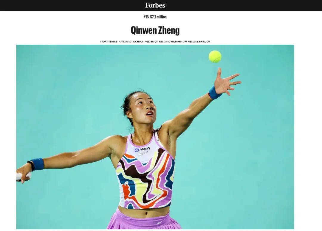 《福布斯》公布的2023年度体坛收入最高的女子运动员榜单显示,郑钦文以720万美元(约合人民币5100万元)位列第15名,其中有550万美元(约合人民币3944万元)的收入来自10余家企业与品牌的商业代言等项目。