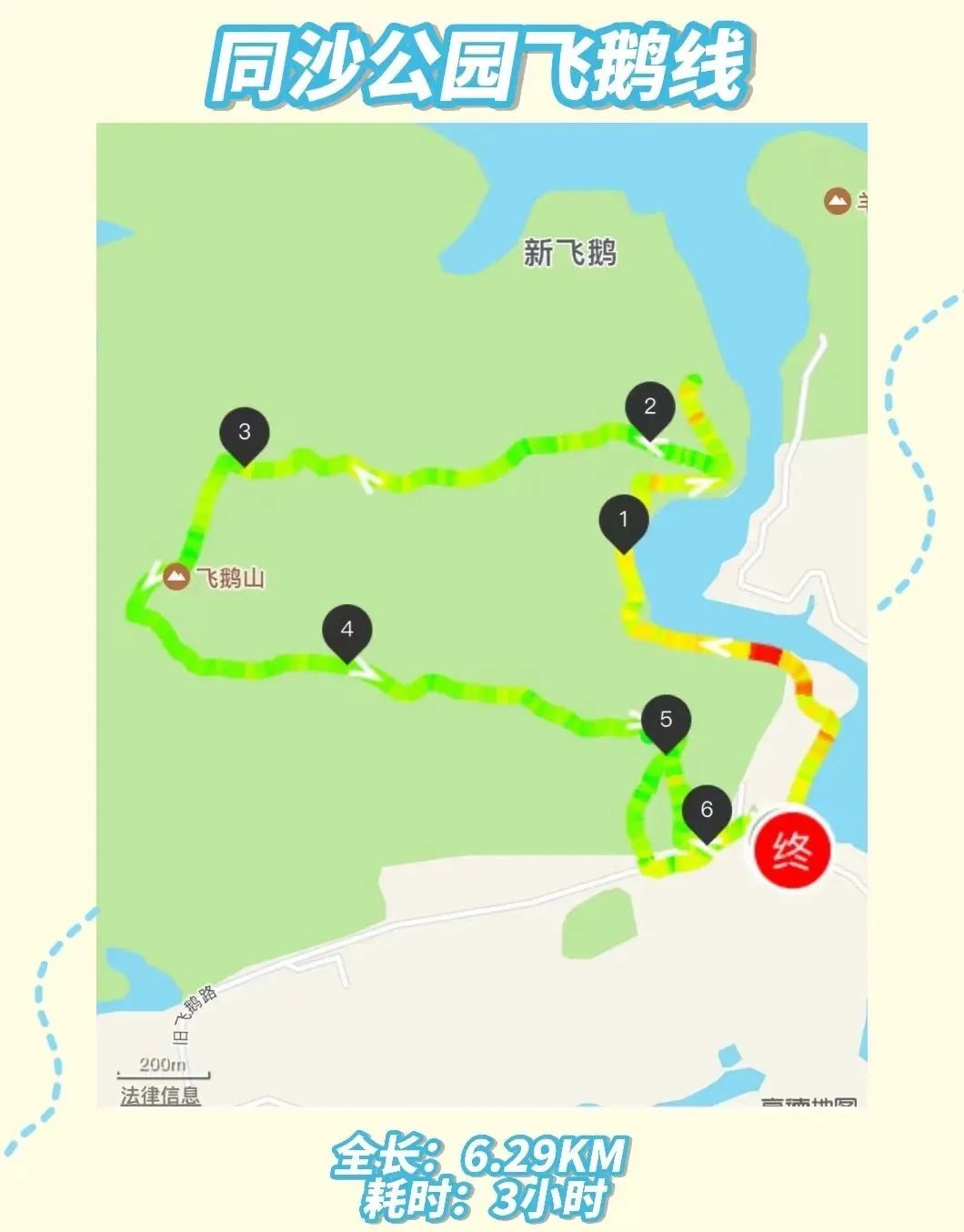具体路线:同沙公园北门—黄公山顶—同沙健康驿站—和香阁—翠拥亭—公园南门—跨湖桥—飞鹅山顶—婚育文化园—打石山草坪—公园西门—白鹭园—北门