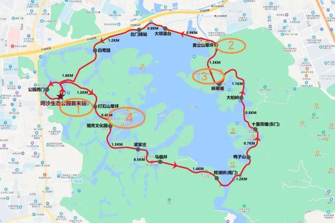 具体线路:同沙公园西门—打石山草坪—婚育文化园—梁家庄—马榴井—跨湖桥—公园南门—鸭子山—十里荷塘—大柏岭—映翠湖—黄公山草坪—大坝瀛台—公园北门—白鹭园—西门