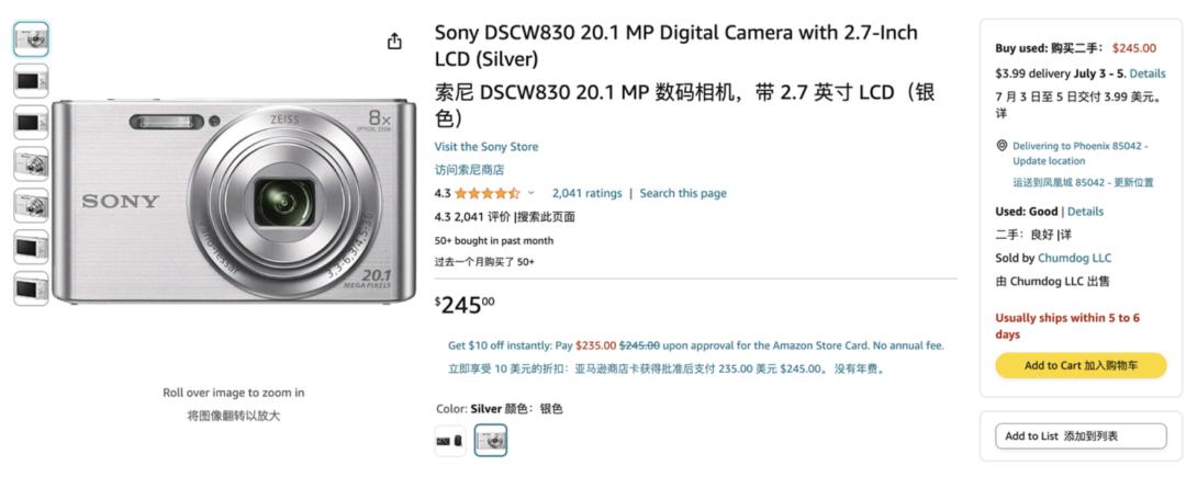 相比之下,和DSC-W830同一年上市的神机iPhone 6,目前二手市场回收价只有150元左右,约为发布定价的3%。苹果在两年前就把iPhone 6送进了电子坟场,结束了售后服务。但DSC-W830却越老越香,在亚马逊的二手价格被炒到了245美元。