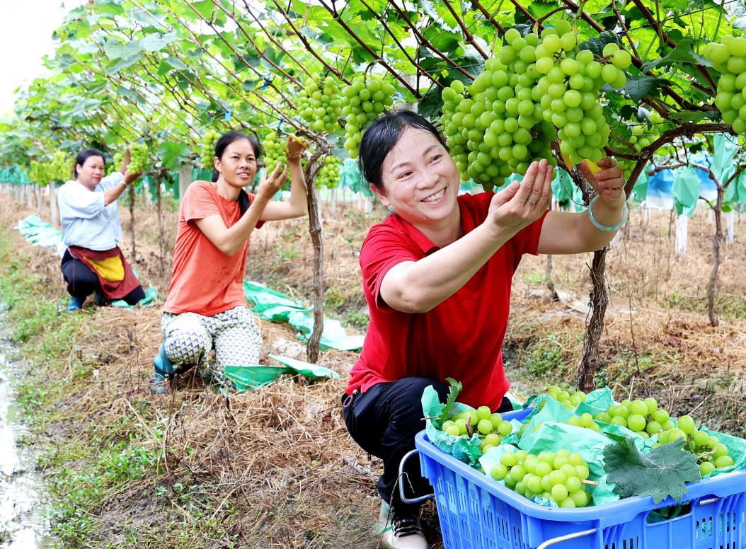 2024年8月1日,佛冈县石角镇诚迳水口村,家庭农场阳光玫瑰葡萄喜获丰收。清远日报签约摄影师 邓振华 摄相比传统的水果销售模式,“采摘乐”这种全新的农业发展模式备受珠三角游客青睐。上午赏花摘果,中午吃农家菜,兴致而来尽兴而归,成为清远“水果经济”的一个常态。