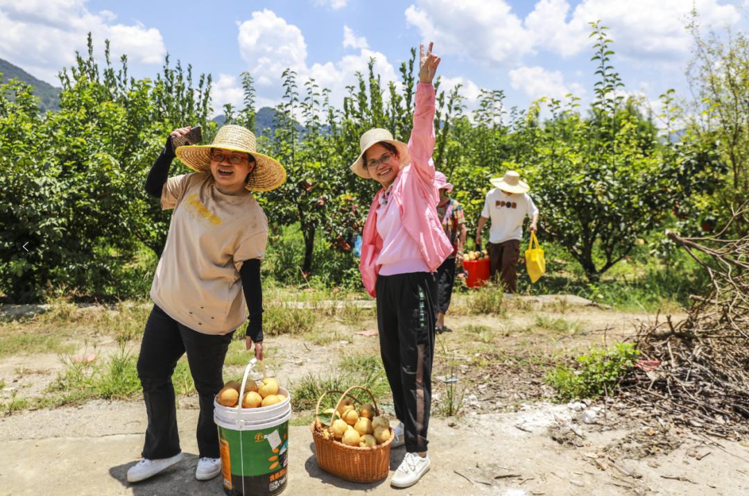 2024年8月9日,阳山县黎埠镇均安村,游客在家庭农场采摘晶宝梨。清远日报签约摄影师 冯国志 摄阳山各乡镇以特色农业为基础,深化“旅游+农业”深度融合发展,成功举办“水口萝卜美食徒步节”“水口香瓜节”“岭背柚子节”“柚香节”等特色农业产业节庆活动,打造农旅融合的特色乡村旅游品牌。