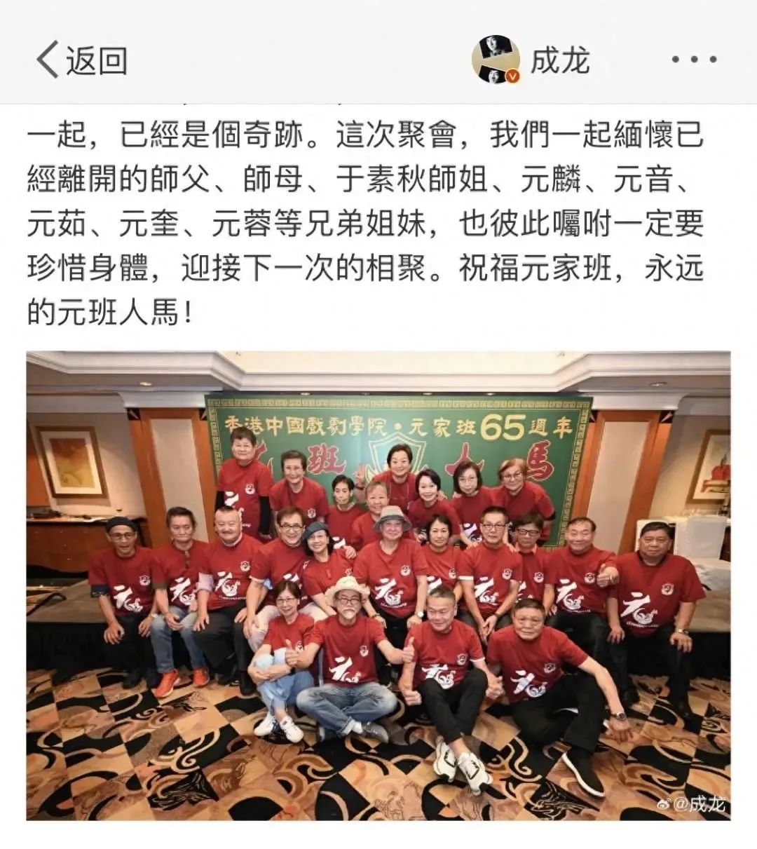 8月12日,著名演员成龙发文纪念元家班成立65周年,并晒出和同门们的大合照。