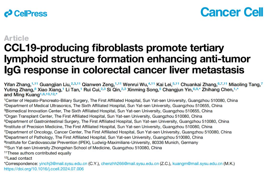 2024年8月12日,中山大学附属第一医院匡铭教授、尹长军教授等在 Cancer Cell 期刊发表了题为:CCL19-producing fibroblasts promote tertiary lymphoid structure formation enhancing anti-tumor IgG response in colorectal cancer liver metastasis 的研究论文。