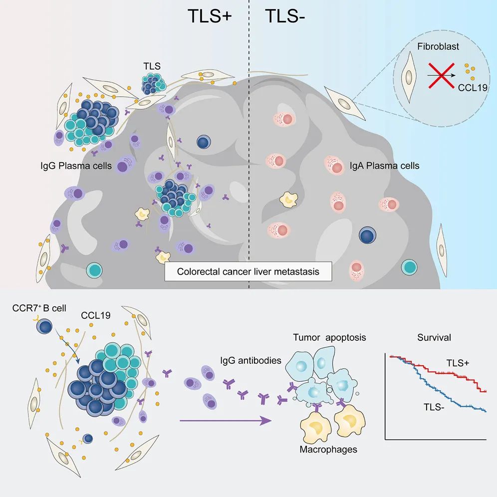 该研究揭示了三级淋巴结构(TLS)在结直肠癌肝转移(CRLM)中的分布、功能和临床意义,发现了CCL19+成纤维细胞在TLS形成中的核心作用,证明了TLS原位产生靶向肿瘤的抗体可介导抗肿瘤免疫。