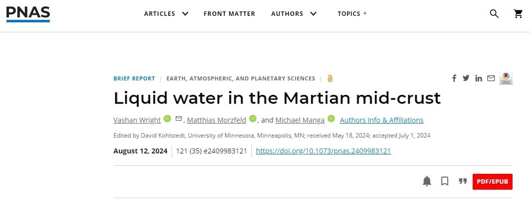 这项名为《火星地壳里的液态水》的研究报告,由美国加州大学圣迭戈分校斯克利普斯海洋研究所和加州大学伯克利分校的三位学者共同撰写,周一已发表在《美国国家科学院院刊》上。