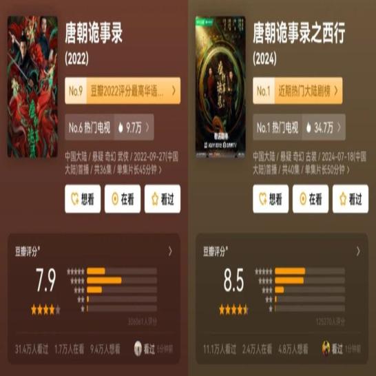 豆瓣8.5,超过第一部的评分,以及站内多次破万的热度值也在说明,在续集创作上,《唐诡西行》摸索出了一条可行的道路。