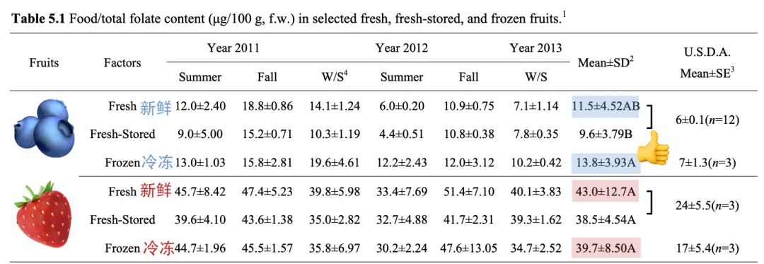 草莓在新鲜、冷藏、冷冻三种处理方式下的叶酸含量没有显著差异。冷冻蓝莓的叶酸含量显著高于新鲜冷藏的蓝莓,与新鲜蓝莓相比也略高。
