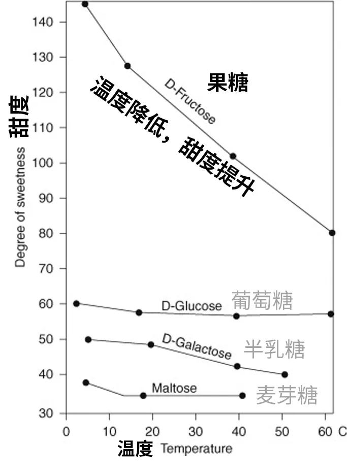 左图:温度越低,果糖的甜度越高;右图:温度越低,呋喃型果糖向更甜的吡喃型果糖转化。图片来源:文献[8][9] 点击可放大查看。平白无故变好吃,还没额外添加糖,就问你是不是来报恩的!