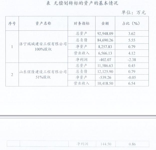 经济导报记者 段海涛济南高新城建投资有限公司8月12日发布公告,为优化国有资产布局,经公司内部会议决定,公司拟将持有的济宁瑞城建安工程有限公司100%股权和山东煜隆建设工程有限公司51%股权无偿划转至济宁高新财金投资有限公司。