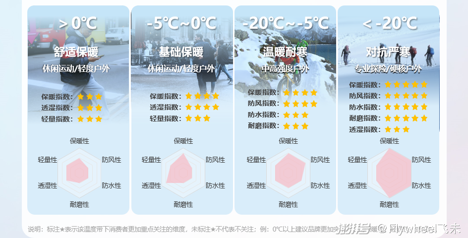 六边形标准对羽绒服的功能性进行了细致的分类,根据不同使用场景和温度条件,为消费者提供了明确的功能匹配建议,涵盖舒适保暖、基础保暖、温度耐寒、对抗严寒等温度场景 。它不仅帮助商家精准定位产品,优化推广策略,也辅助消费者的购买决策,帮助他们在不同温度条件下找到适合自己的装备。
