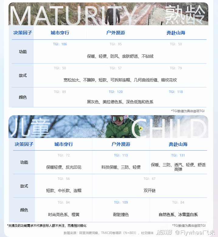 通过深入剖析消费者在选购运动户外羽绒服时的决策动因与商品偏好,我们洞察到消费者需求更加精细与多元。这些需求覆盖了面料材质、款式设计,风格色彩及功能性等各个关键维度。