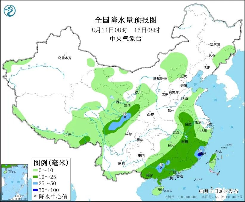 8月14日08时至15日08时,甘肃东南部、川西高原北部、江淮西部、江南中东部和南部、华南大部、台湾岛等地部分地区有中到大雨,其中,福建东南部等地局地有暴雨(50~70毫米)。