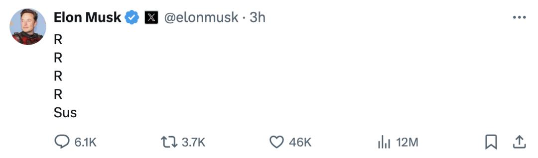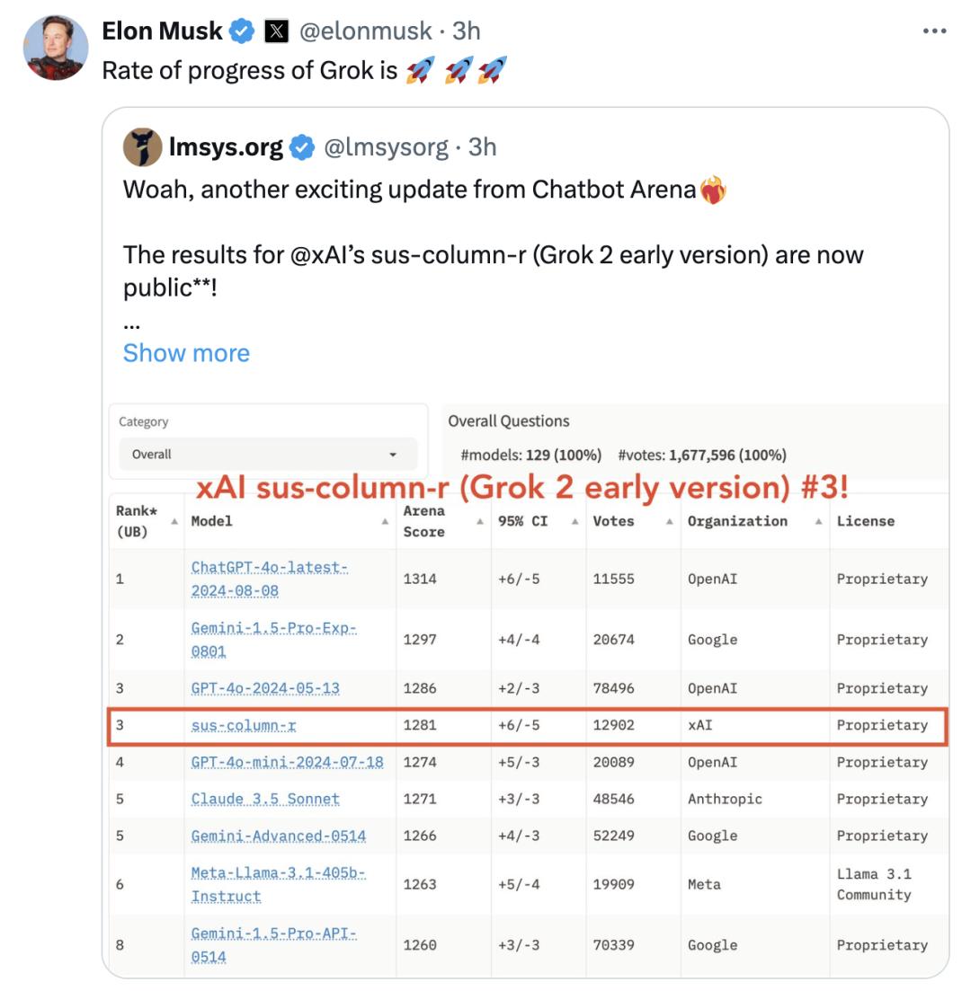 马斯克在自家社交平台X上激情发文,揭开Grok-2在Lmsys大模型竞技场上的“马甲”——sus-column-r。