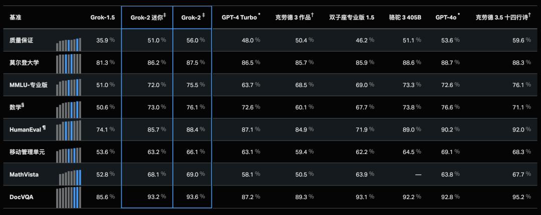 值得一提的是,Grok-2在视觉任务上表现出色,特别是在视觉数学推理(MathVista)和基于文档的问答(DocVQA)方面表现尤为出色。