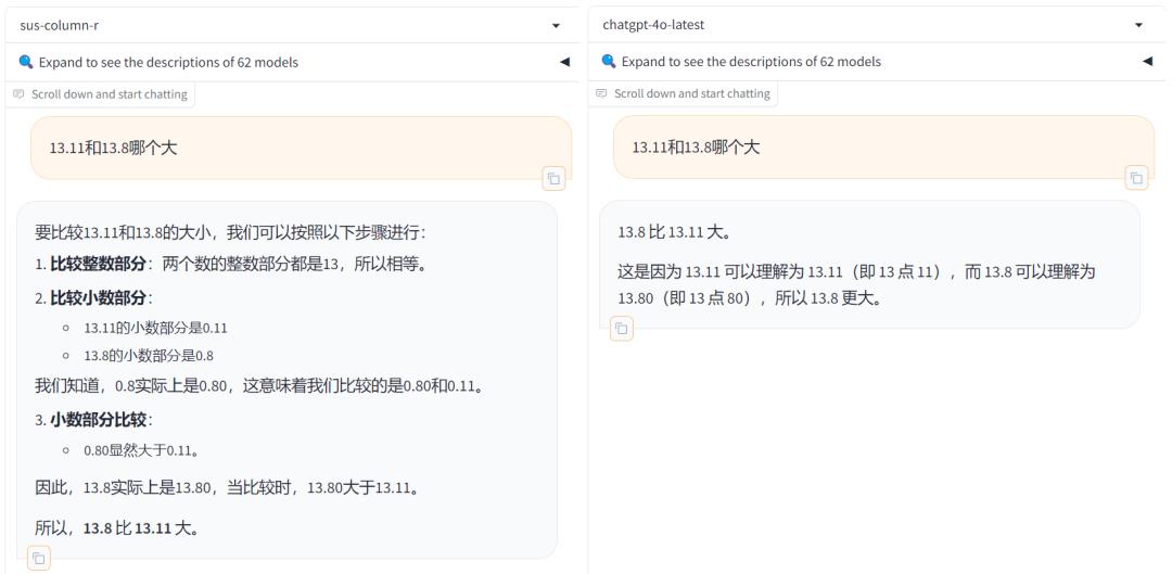 首先是前段时间让一众模型翻车的比大小问题:13.11和13.8哪个大。Grok-2和GPT-4o都准确回答,不过Grok-2的思考过程更清晰,列出了详细的思考步骤。