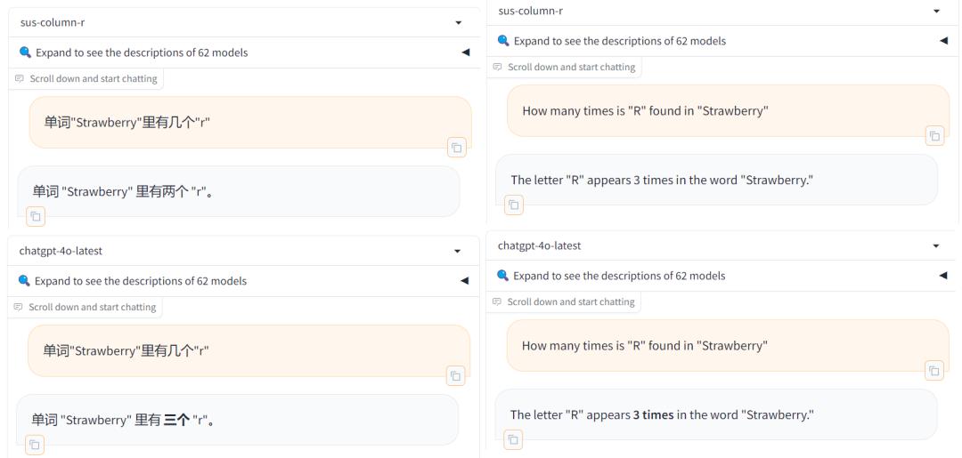 在另一个经典问题“Strawberry中有几个r”上,Grok-2一开始答错了,但换成用英文提问后又给出了正确答案,GPT-4o则是中英文都回答正确。看来大模型还是会存在碰运气的成分。