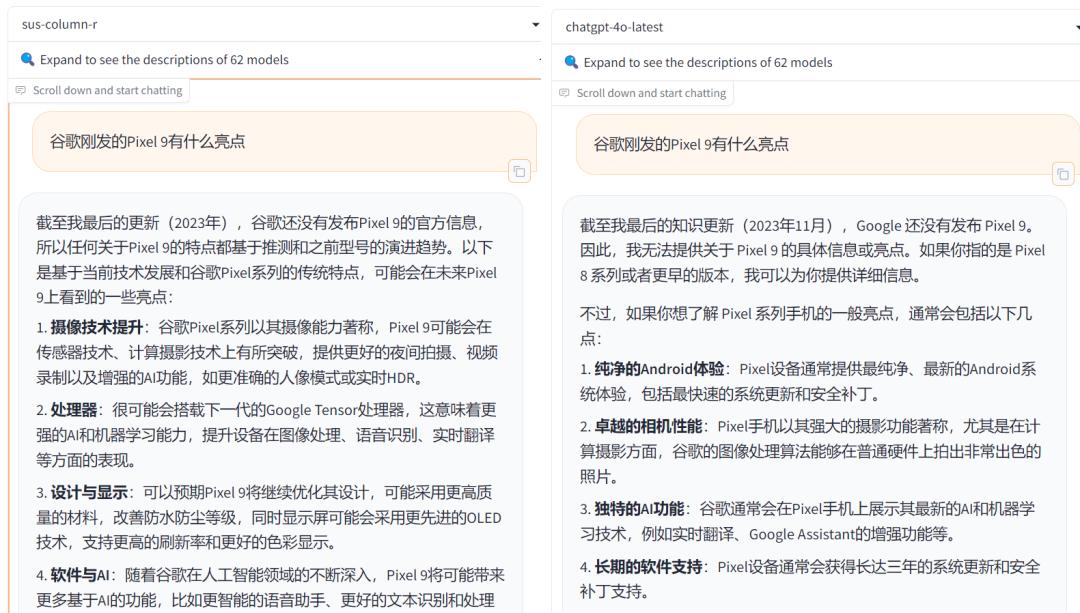 大模型竞技场中的模型没有实时联网,当我询问“谷歌刚发的Pixel 9有什么亮点”,两款模型都称自己还未掌握这一信息。随后Grok-2根据技术发展趋势和Pixel以往的特点给出了预测,有一说一猜得还挺靠谱,摄像、处理器、AI等都是谷歌这次更新的重点。