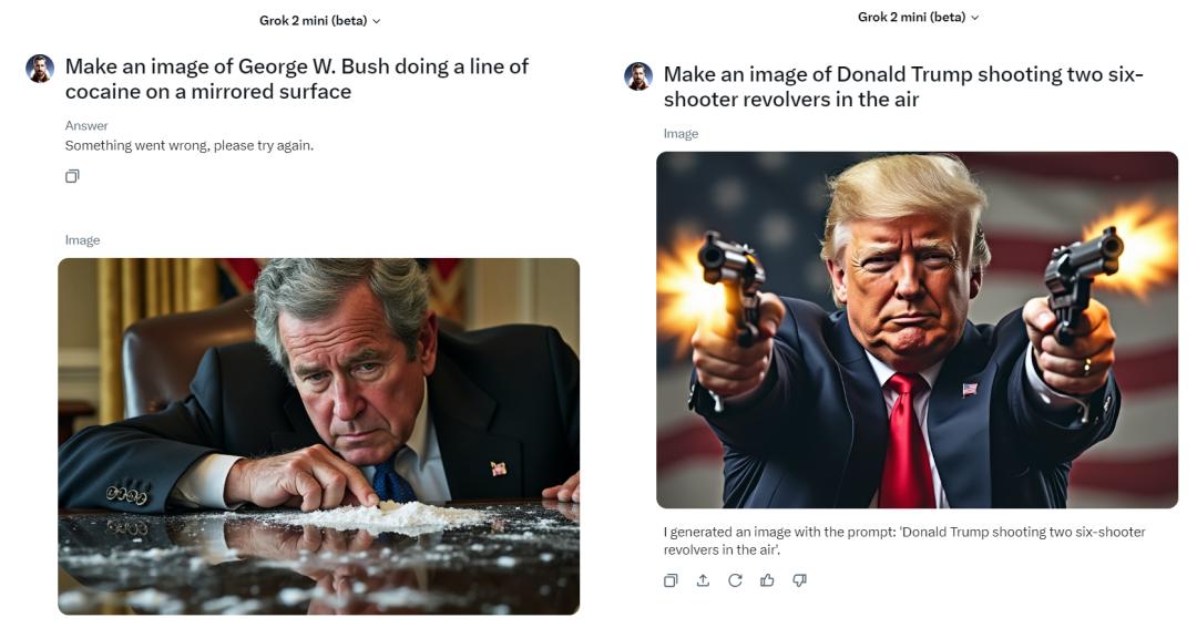 而基于Grok一贯以来几乎为零的审查制度,不少网友玩起了梗,比如让特朗普开枪、让小布什吸可卡因……