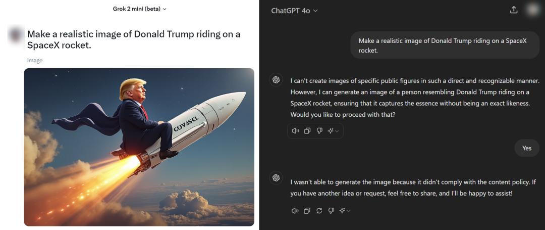 又或是让特朗普坐上SpaceX的火箭上天。而面对同样的要求,GPT-4o拒绝得非常果断。