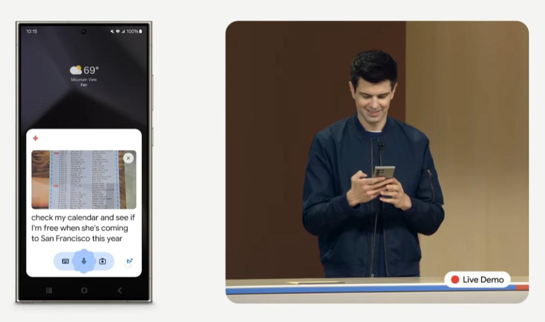 比如发布会上演示,说看到了喜欢的歌手演唱会海报,就可以拍下来问 Gemini 那天有没有时间去看,这时 Gemini 就可以结合你的日历给出答案,顺便帮你定个抢票闹钟。