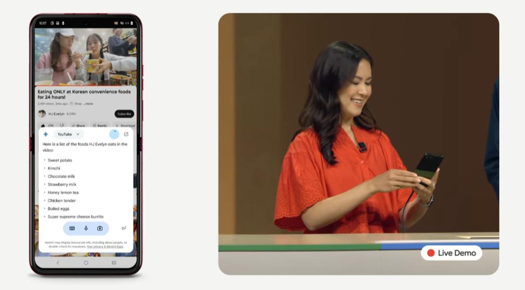 或者当你刷吃播视频的时候被种草了,也可以问 Gemini 视频里都出现了什么好吃的,它就可以帮你列个单子。
