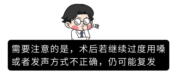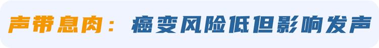 这种息肉恶变概率极低,但会造成明显的咽喉不适,导致声音嘶哑、声音疲劳、喉咙异物感、咳嗽等各种问题。如果息肉较小,可以先采取保守治疗(如声带休息、药物治疗、声音训练),症状没有改善的,建议采用全麻支撑喉镜下声带息肉摘除术。