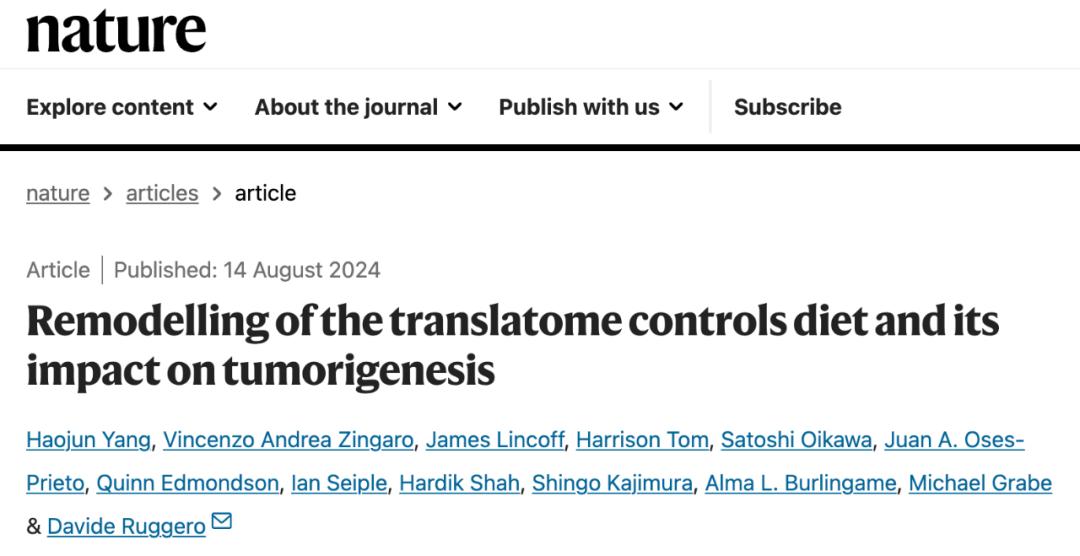 2024年8月14日,加州大学旧金山分校 Davide Ruggero 团队(博士后杨浩君为论文第一作者)在国际顶尖学术期刊 Nature 上发表了题为:Remodelling of the translatome controls diet and its impact on tumorigenesis 的研究论文。