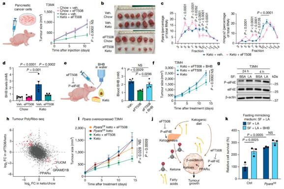 由于胰腺肿瘤可以在脂肪的作用下生长,而且eIF4E在脂肪燃烧时更活跃,因此,研究团队让这些小鼠进行生酮饮食,迫使肿瘤只消耗脂肪,然后给它们服用抗癌药物eFT508。在这种情况下,eFT508切断了胰腺癌细胞的唯一能量来源(脂肪代谢),肿瘤也缩小了。