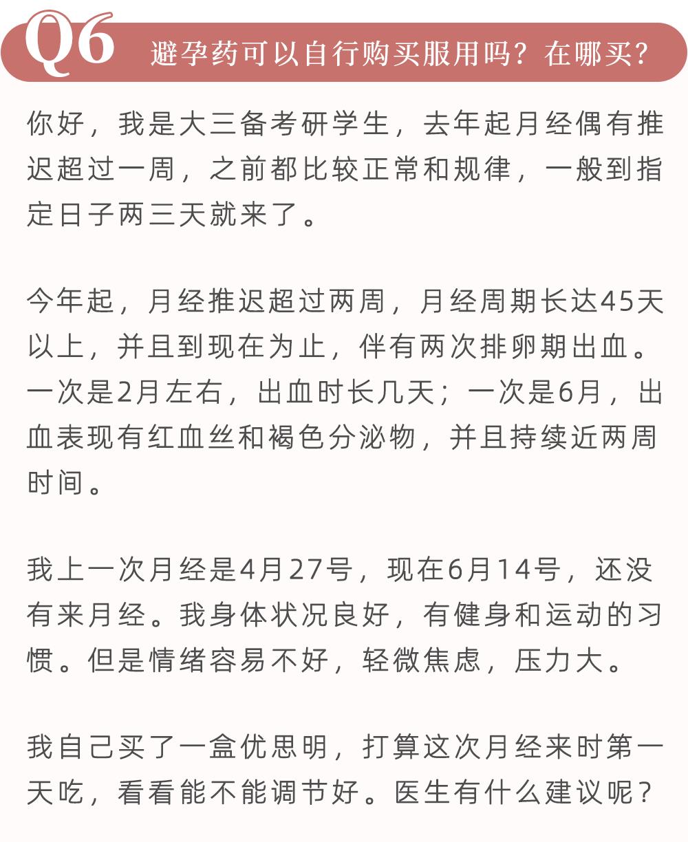 口服避孕药属于非处方药,在药店可以正常购买。但是从问题中女生提到的细节,提醒需要注意的是,月经周期超出两周或以上,伴有两次月经之间的出血,需要及时就诊,寻找异常出血的病因。常见的排卵异常如多囊卵巢综合征这类疾病,最常见的临床表现就是月经的异常改变,排卵异常导致的月经紊乱,可以通过孕激素或者口服避孕药来调节,具体选择哪一种,还需要结合个体情况。