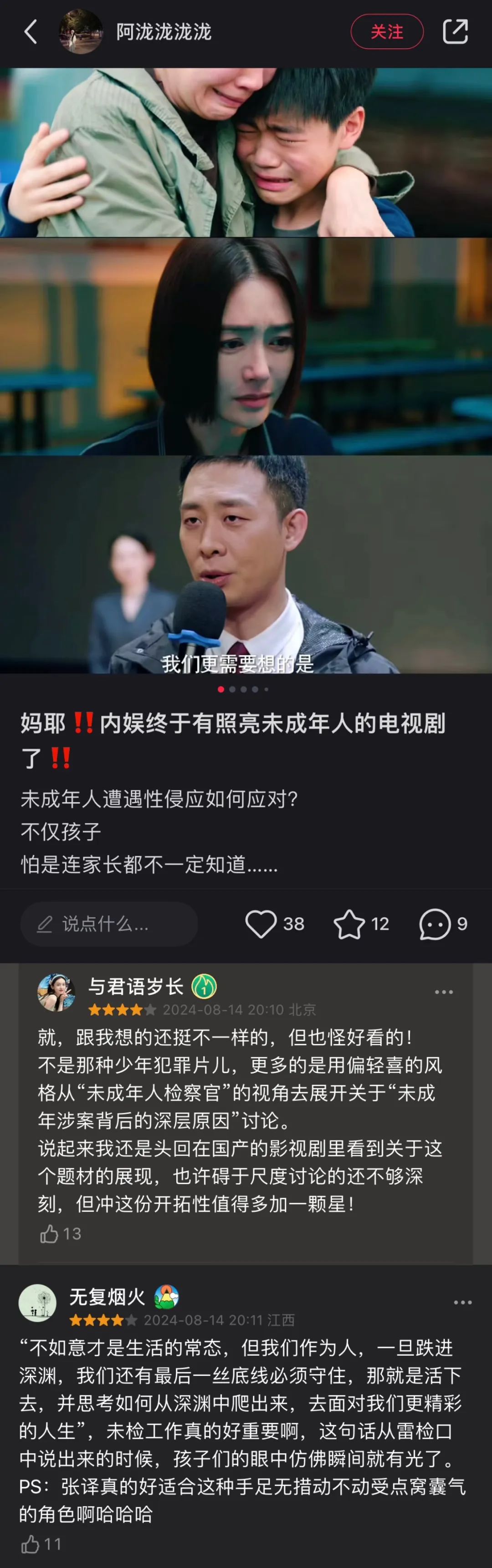 由张译、秦岚主演,最高人民检察院影视中心、新力量文化、老有影视、侦侦日上联合等出品,新力量文化承制,爱奇艺奇喜工作室打造的人“检“烟火涉世剧《九部的检察官》刚开播,就以令人捧腹的生活流喜剧,真实落地的群像刻画和紧张复杂的案件抓紧观众。网友感叹:“内娱终于有照亮未成年人的电视剧了!”