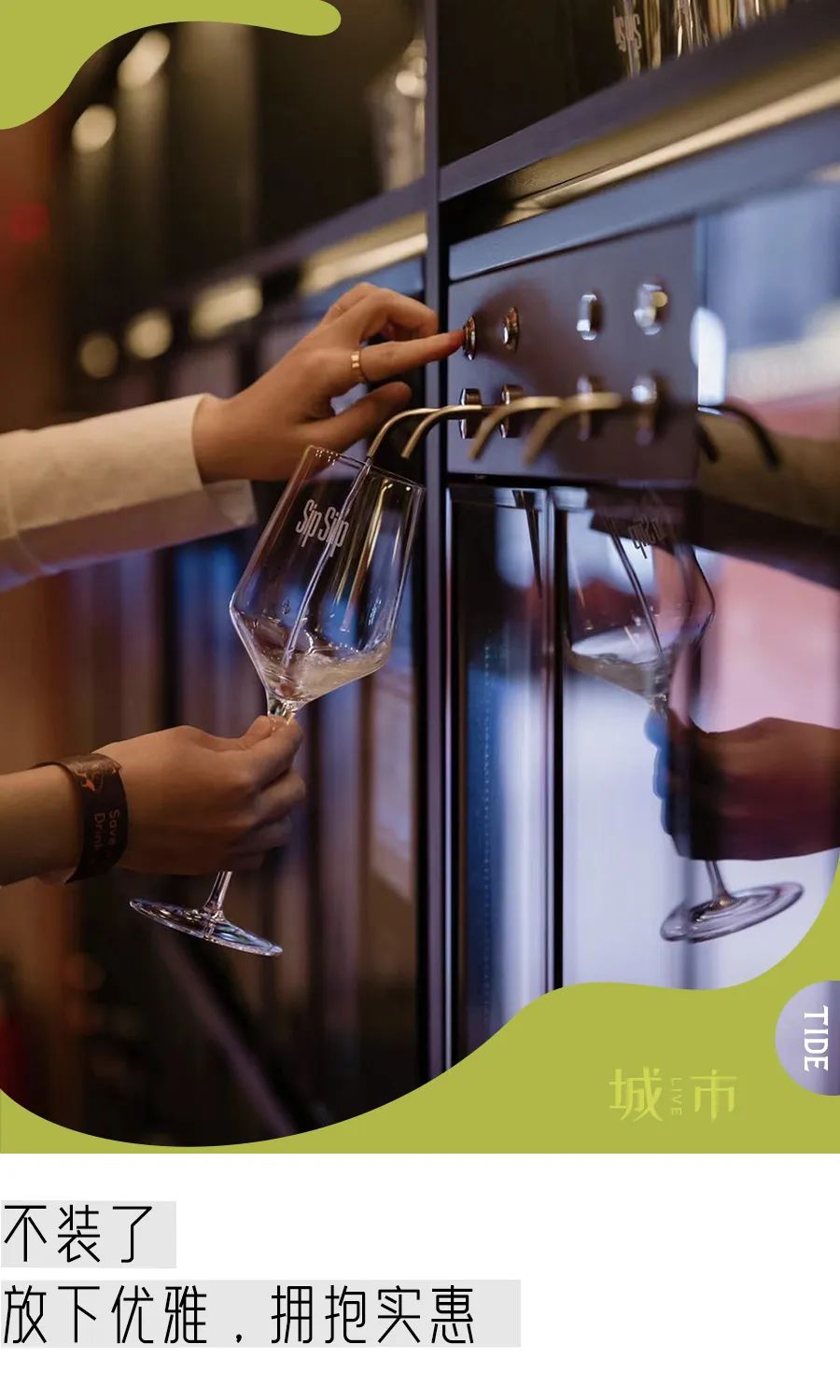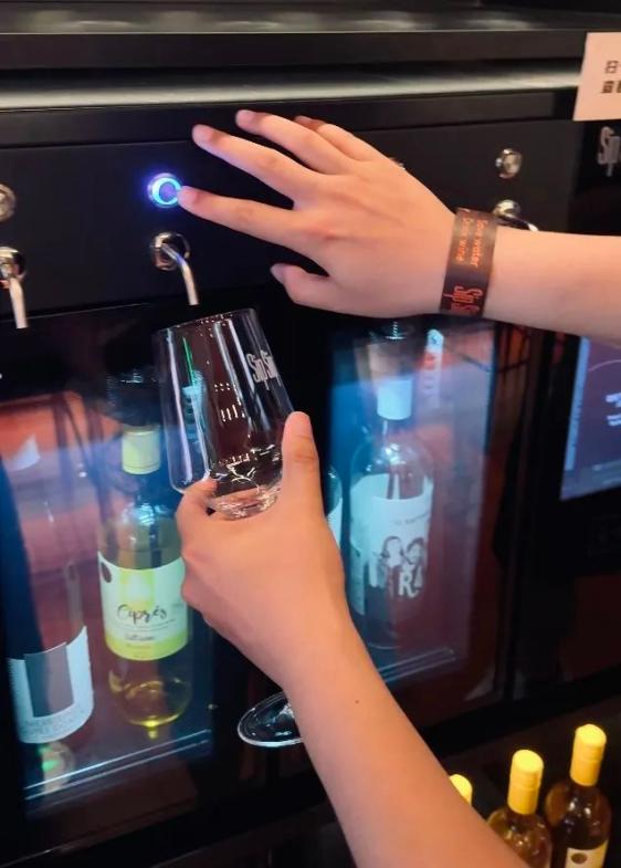 首先下单后你会获得一个手环,其中装有一块芯片。之后你就可以走到那一套仿佛“专门为葡萄酒畅饮而生”的智能保鲜分杯机(自动打酒器)前挑选想喝的酒了。