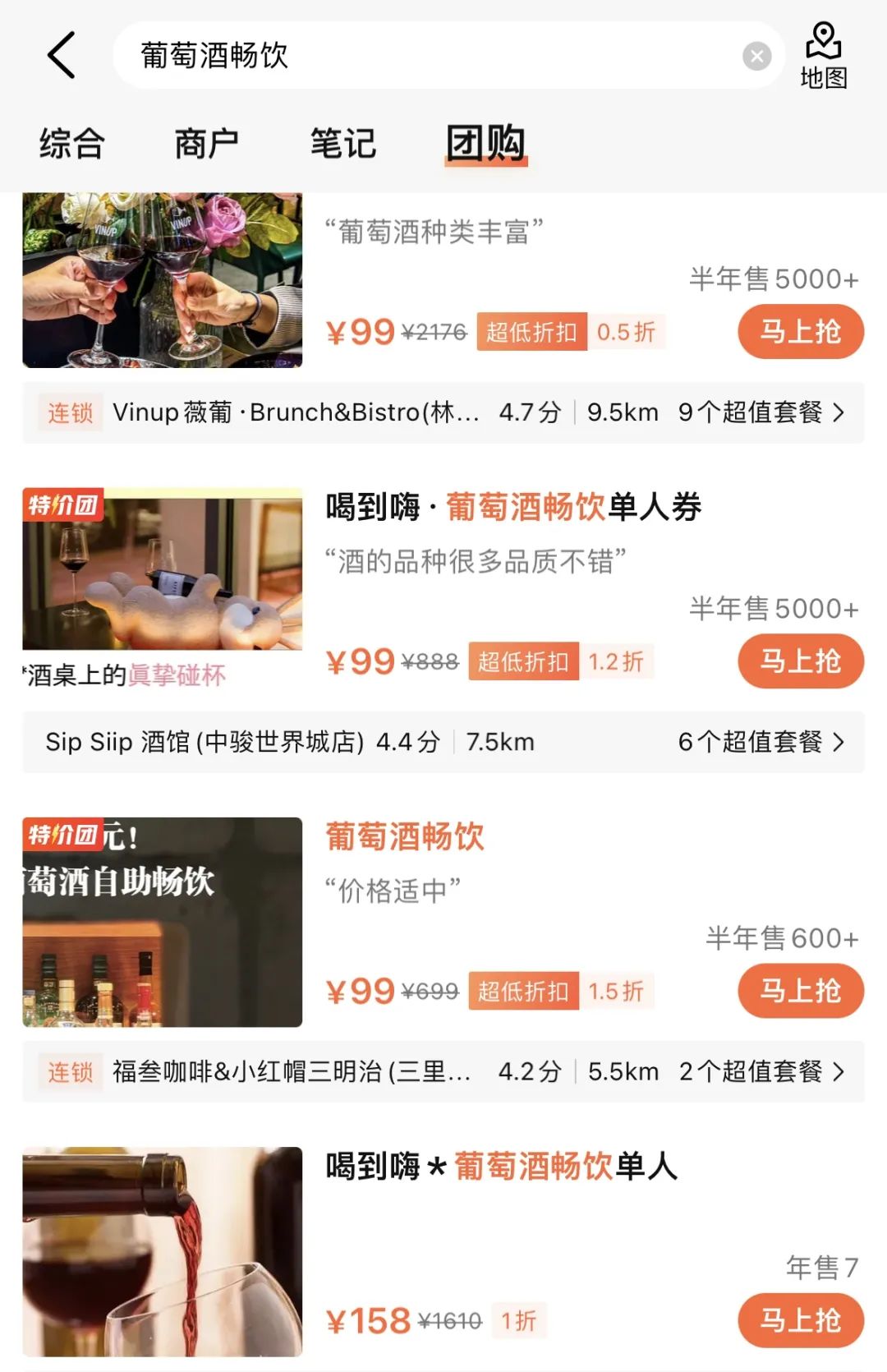 ● 大众点评上的“葡萄酒畅饮”团购搜索页面这个价格,甚至比很多啤酒畅饮还要便宜。