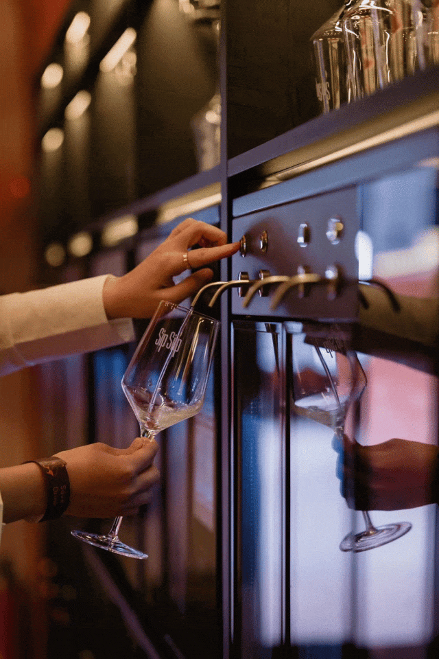 ● Sip Siip店内的自动打酒机每个恒定低温、且充满了氮气的机子里都摆放着四款不同产区和品种的葡萄酒,这7、8台机器每次都会为你精准地倒出80ml杯量或是30ml试饮。