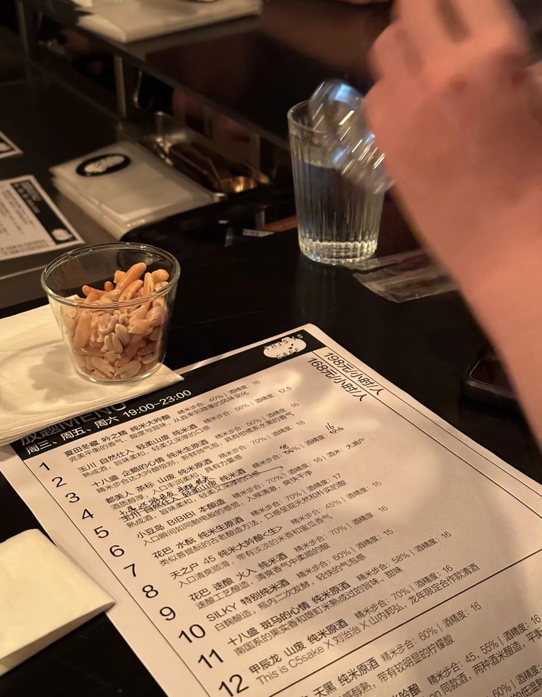 ● 198元/小时比168元/小时多3款限定酒乍一看是不是觉得时间太短了?不过在店内紧凑的L形吧台位和清酒的催化下,1小时足以让两个陌生的i人脸红话多起来,说不定喝完还能勾肩搭背地一起去吃宵夜。