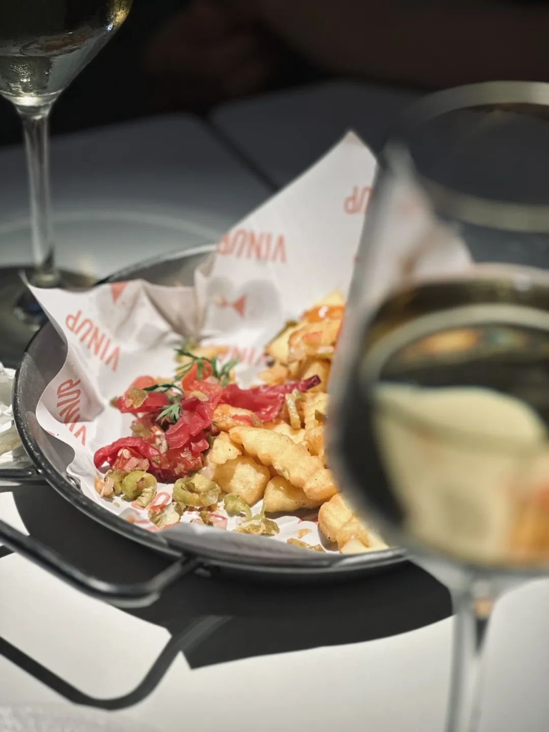 ● Vinup薇葡店内的餐品“脏脏薯条”在Sip Siip的菜单上,有38元的金桔藤椒鸡肝,也有158元的云南火腿佐乳扇,和Vinup薇葡一样,餐品的均价大概在80元左右。
