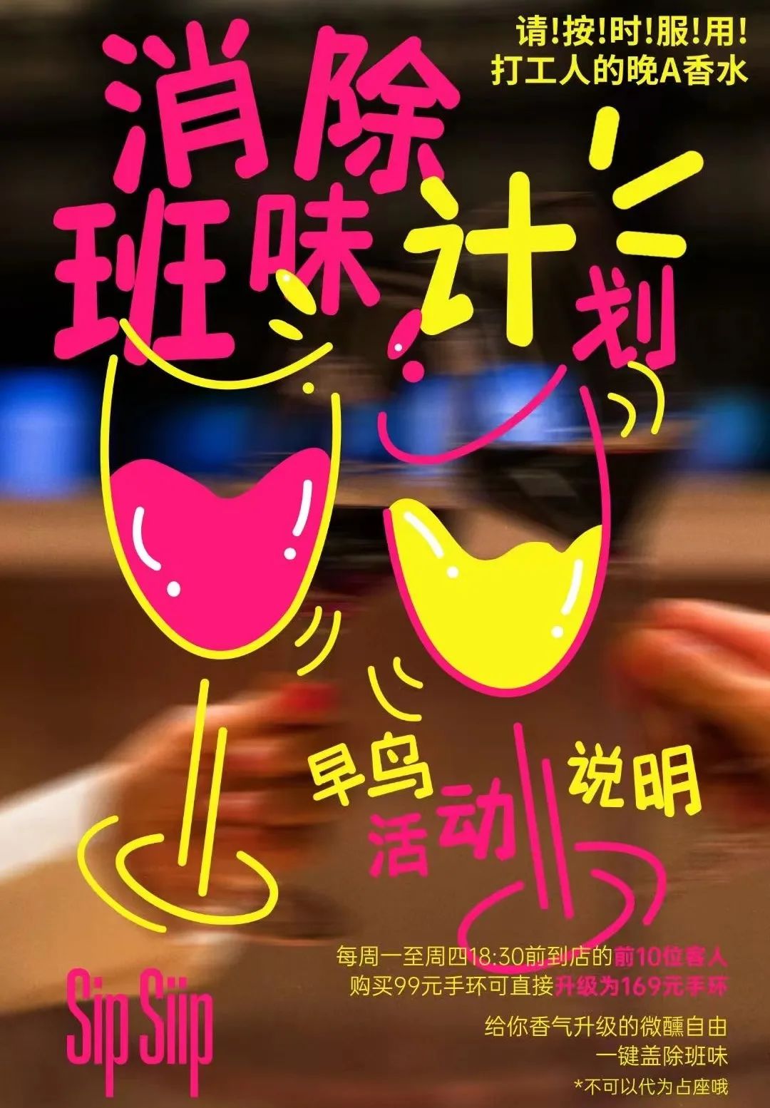 最近他们还上新了每周一到四的“消除班味计划”——18:30前到店的前10位客人购买99元手环可直接升级为169元手环。老板解释说这样做一方面是为了充分利用酒馆的下午时段,吸引更多客人更早到店从而提高翻台率,另一方面18:30以前进店的客人大多有用餐需求,客单价可以因此提升上去。