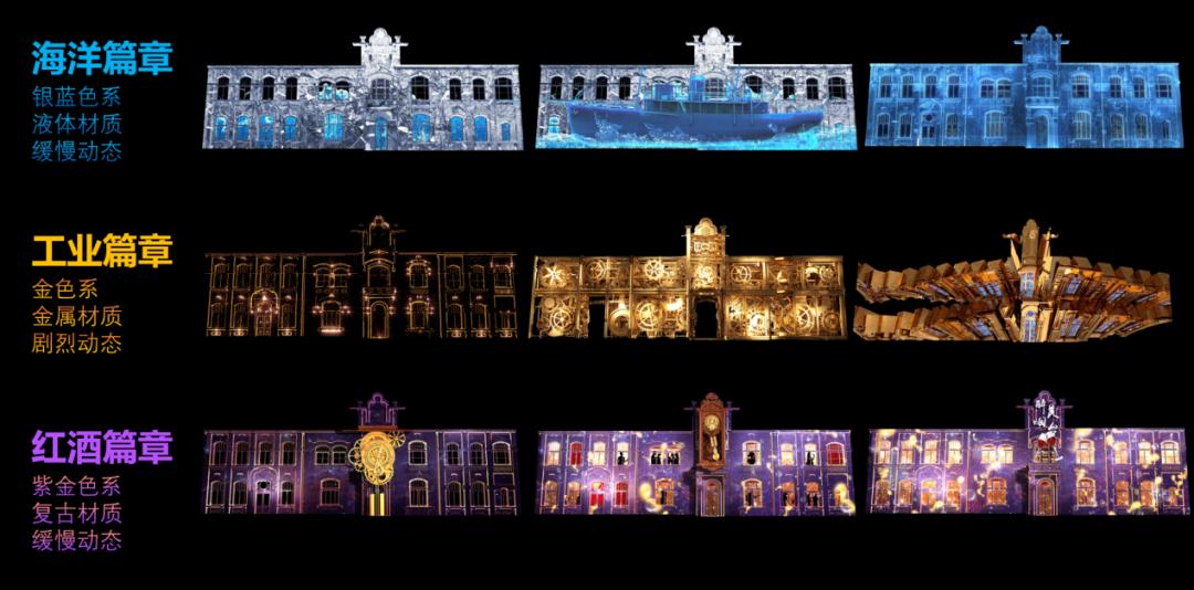 地标节点烟台山从远观视角、街道通行、近景观看三个视线持续视线引导,高潮震撼体验。烟台山灯塔首次360度环形投影,对内容设计、动画制作有新挑战。