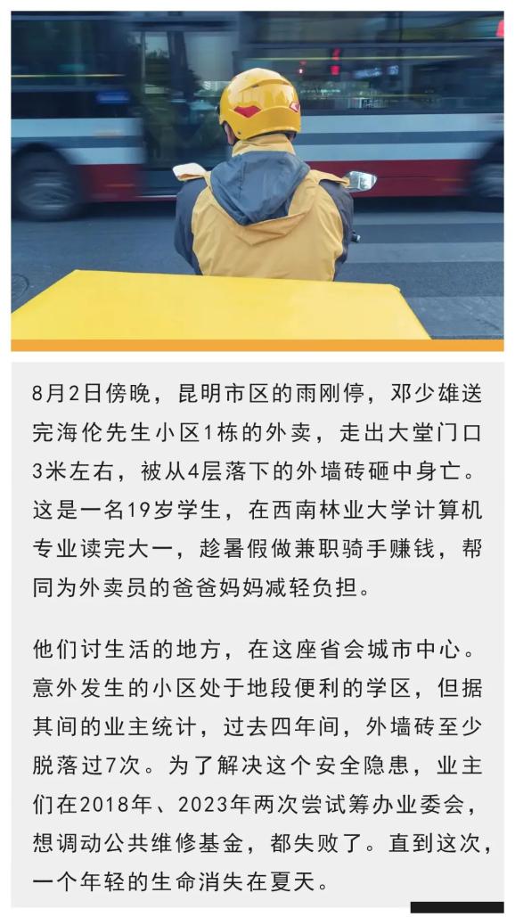 邓少雄刚在西南林业大学计算机专业读完大一,趁假期做了兼职骑手。老邓后来在儿子手机里看到,8月2日下午5点左右有一单海伦先生小区1栋的外卖,客户点了一份干拌面和一碗贵妃醪糟。按5点43完成订单的时间,老邓估算,儿子大概是5点45分从电梯下来,走出大楼后被脱落的外墙砖砸中。
