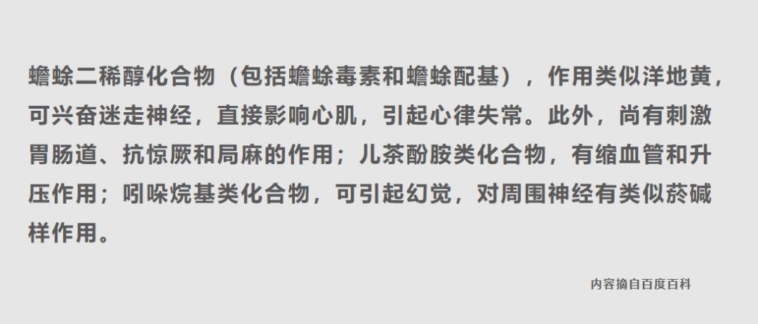 从这成分表来看,蟾毒素亦正亦邪。有毒成分主要分为两大类,一类是蟾蜍二稀醇化合物(例如蟾蜍配基和蟾毒他灵),是一种强心苷,对动物是有害的,食用后容易死亡。