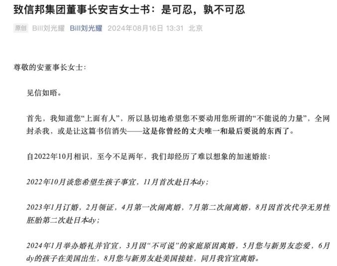8月16日,95后CEO、服饰品牌bosie(伯喜)创始人刘光耀在个人微信公众号发布《致信邦集团董事长安吉女士书:是可忍,孰不可忍》公开信,回应两人结婚、代孕、离婚及关系崩裂始末,并针对骗婚、形婚、债务等问题向前妻提出质疑。