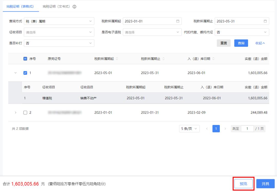 (2)如需预览税收完税证明后开具。①点击【预览】,系统跳转至预览开具界面。