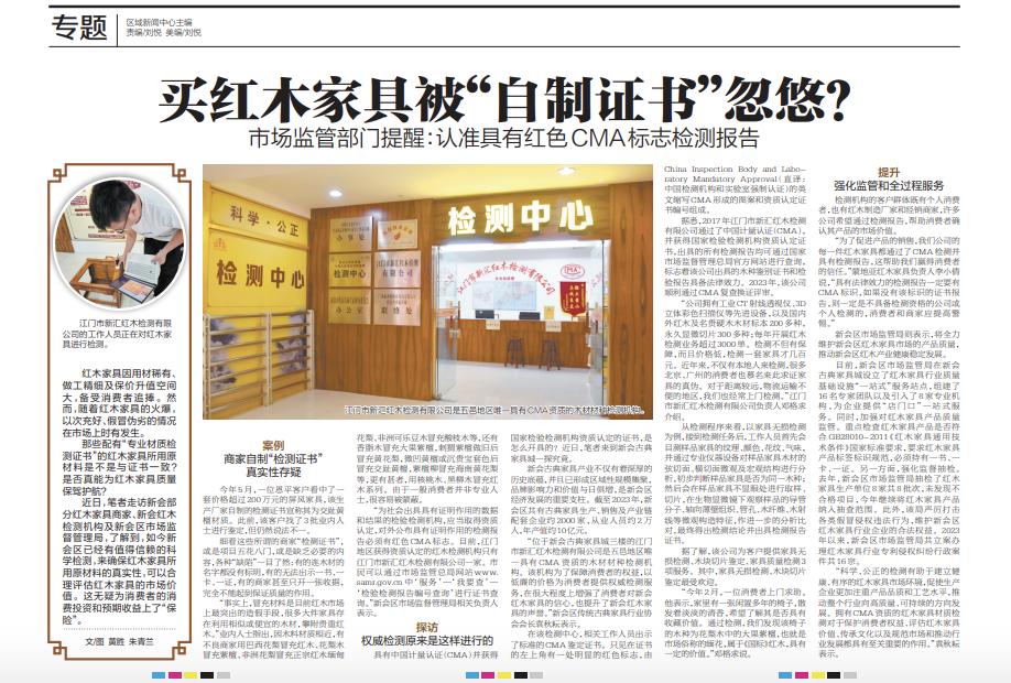 “科学、公正的检测有助于建立健康、有序的红木家具市场环境,促使生产企业更加注重产品品质和工艺水平,推动整个行业向高质量、可持续的方向发展。拥有CMA资质的红木家具材质检测对于保护消费者权益、评估红木家具价值、传承文化以及规范市场和推动行业发展都具有至关重要的作用。”袁秋耘表示。原标题:《买红木家具被“自制证书”忽悠?市场监管部门提醒:认准具有红色CMA标志检测报告》