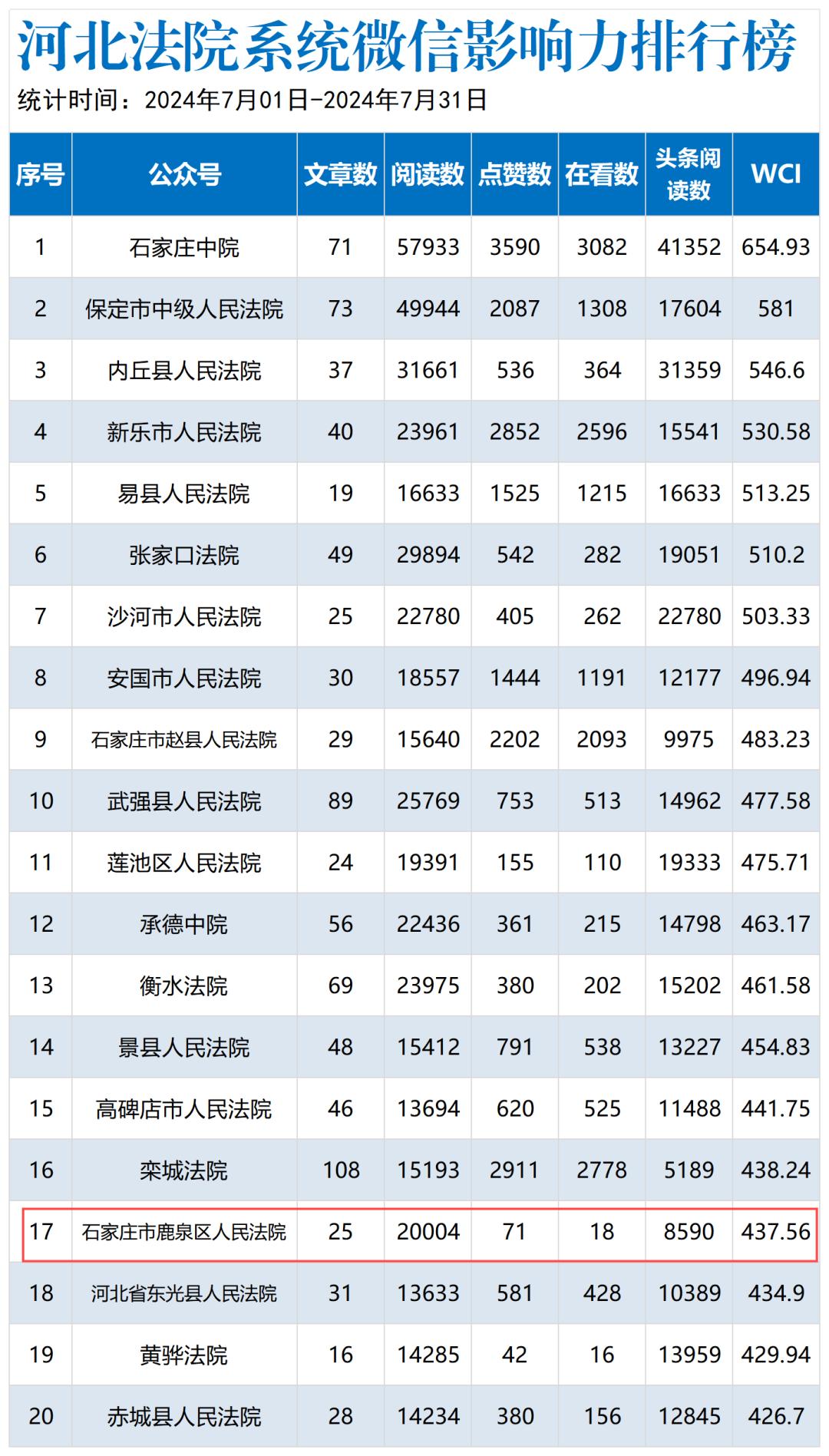 【喜报】2024年7月,石家庄市鹿泉区人民法院微信公众号跨入“河北全省法院系统微信影响力排行榜”