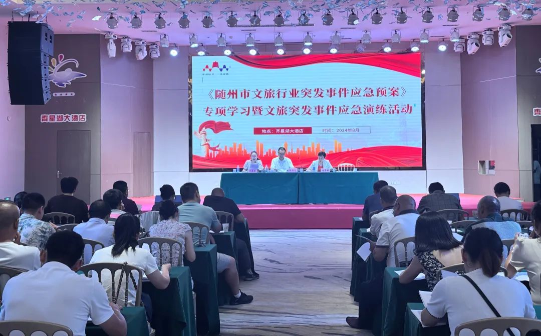 为全面贯彻习近平总书记关于应急管理的系列重要论述,建立健全我市文化和旅游行业应急管理体制和工作机制,规范突发事件应急应对流程,有效有序应对文化和旅游各类突发事件,促进文化和旅游行业安全、有序、健康发展。8月12日,市文旅局组织召开了《随州市文旅行业突发事件应急预案》专项学习暨文旅突发事件应急演练活动。市文旅局分管领导和科室负责人,各县、市、区文旅局、高新区社会事务局分管安全生产的领导和科室负责人,局属单位分管安全工作负责人,各县、市、区文旅市场综合执法大队负责人、高新区综合执法中心分管负责同志,市旅游协会负责人,全市 A 级景区、星级酒店、旅行社安全生产负责人到场参会。
