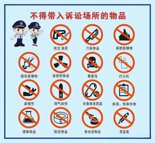 ●不得带:除经人民法院许可,需要在法庭上出示的证据外,下列物品不得携带进入法庭:(一)枪支、弹药、管制刀具以及其他具有杀伤力的器具;